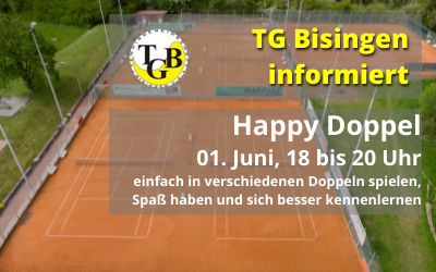 Am Mittwoch, dem 1. Juni, starten wir unser Happy Doppel. Von 18 – 20 Uhr sind alle eingeladen, auf den Tennisplatz zu kommen und in verschiedenen Doppeln einfach zu spielen, Spaß zu haben und sich besser kennenlernen. Je mehr Spielerinnen und Spieler, desto besser!