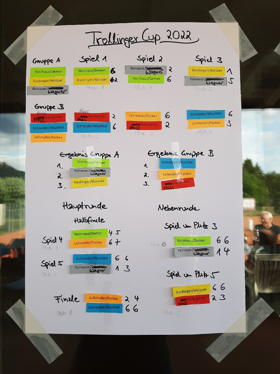 Bei den Herren konnten sich die Lokalmatadoren Jochen Lohmüller und Frank Fecker in der Hauptrunde gegen Kai-Thorsten Neinhaus und Thorsten Demer vom TC Boll durchsetzen und fürs Finale qualifizieren. Dort unterlagen sie nach spannendem Spiel den stark aufspielenden Benjamin Wuchter und Stefan Schneider vom TC Nehren, die gegen Gerd Reinauer und Bernd Wagner vom TC Ostdorf das Finale erreicht hatten und durch den Endspielerfolg den Trollinger-Cup im Bezirk E gewannen.